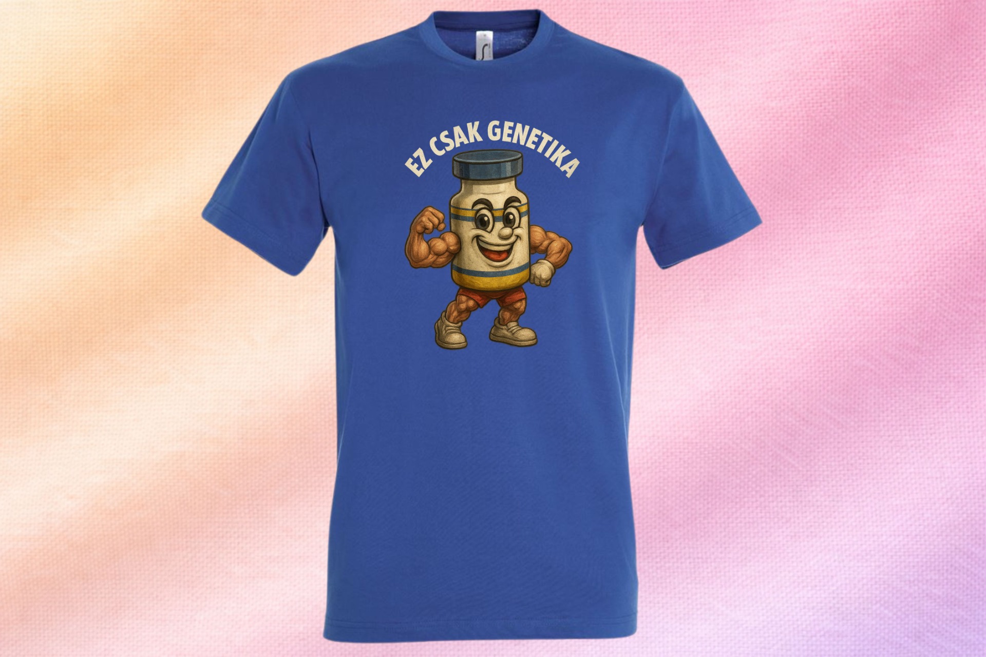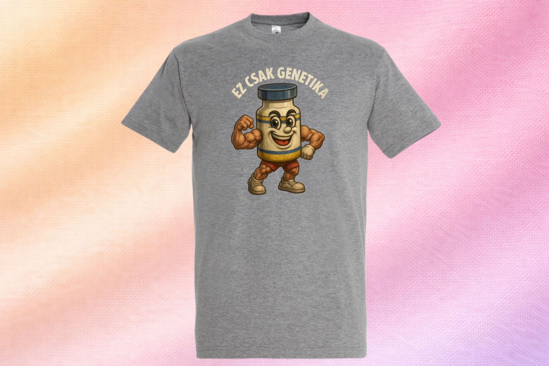 Humoros design "Ez csak genetika" felirattal és izmos figura grafikával. Tökéletes választás edzőterembe vagy sportos hétköznapokra.
