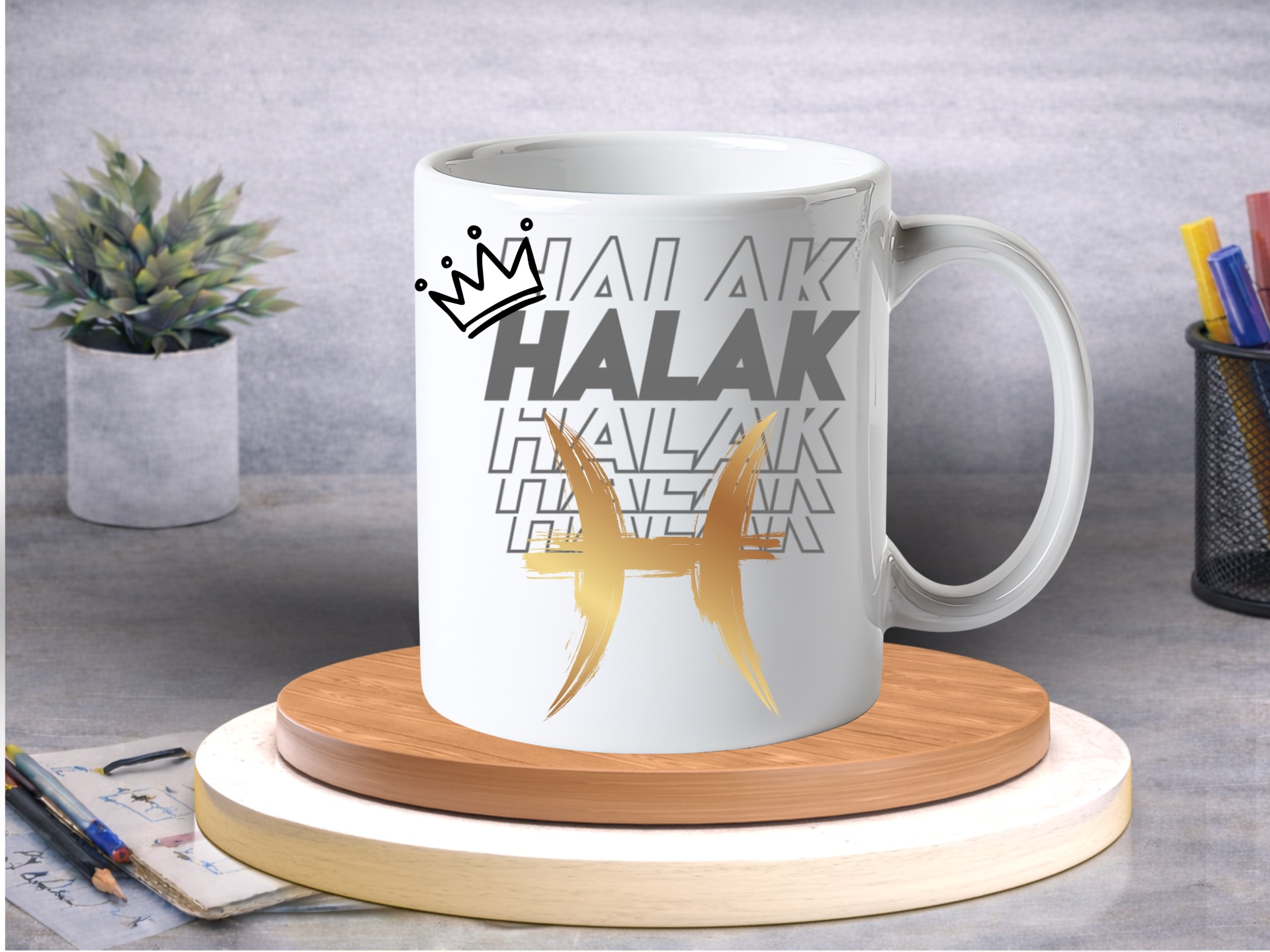Ez a modern, letisztult design a jegy finom, mégis erőteljes energiáját tükrözi. A rétegzett "HALAK" tipográfia harmonikus alapot ad, míg az arany szimbólum lágy, mégis karakteres vonalakkal jelenik meg a kompozícióban. A korona a belső világ gazdagságát és az egyedi látásmódot jelképezi.