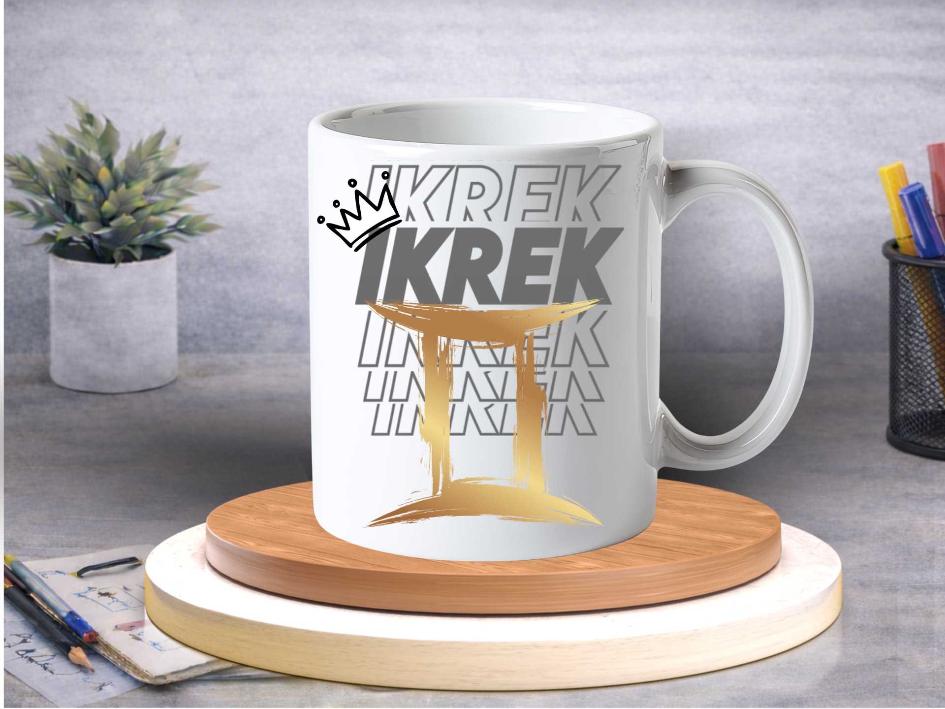 A rétegzett "IKREK" tipográfia lendületet ad a designnak, míg az arany szimbólum karakteres, mégis elegáns fókuszpontként emelkedik ki. A korona pedig nem véletlen: az Ikrek mindig egy lépéssel előrébb jár.