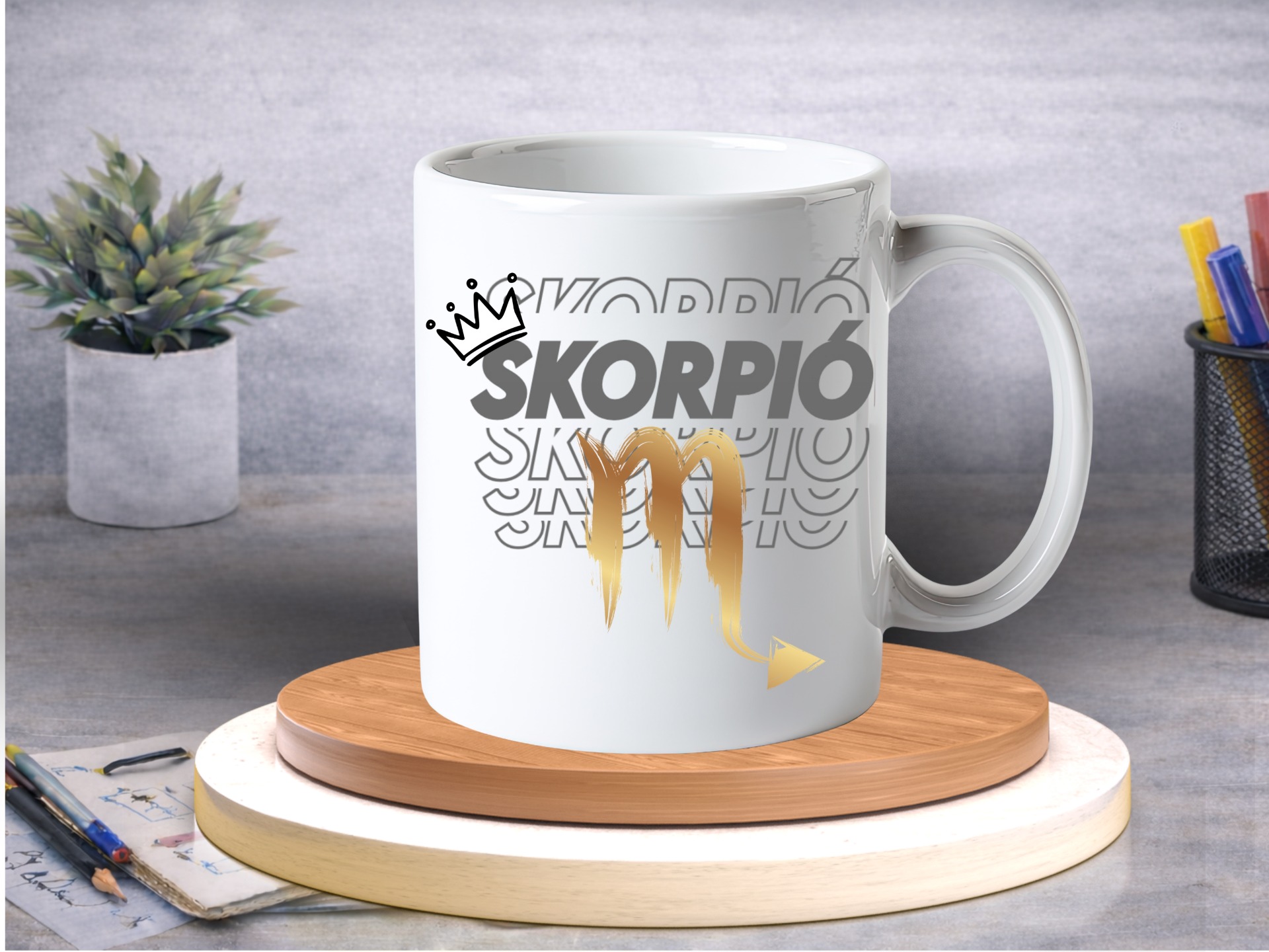 Ez a modern, letisztult design a jegy intenzív energiáját emeli ki. A rétegzett "SKORPIÓ" tipográfia határozott alapot ad, míg az arany szimbólum karakteresen, szinte pengeszerű vonalakkal jelenik meg a kompozícióban. A korona a belső hatalom és az önazonosság jelképe.