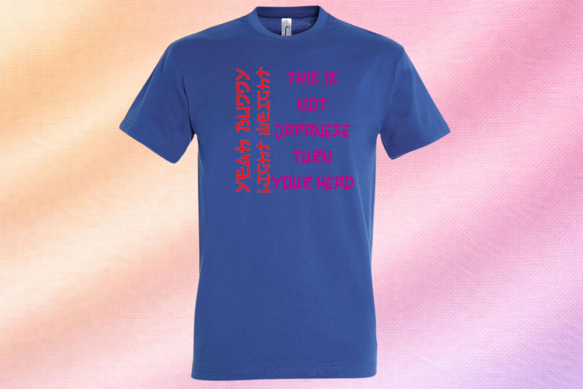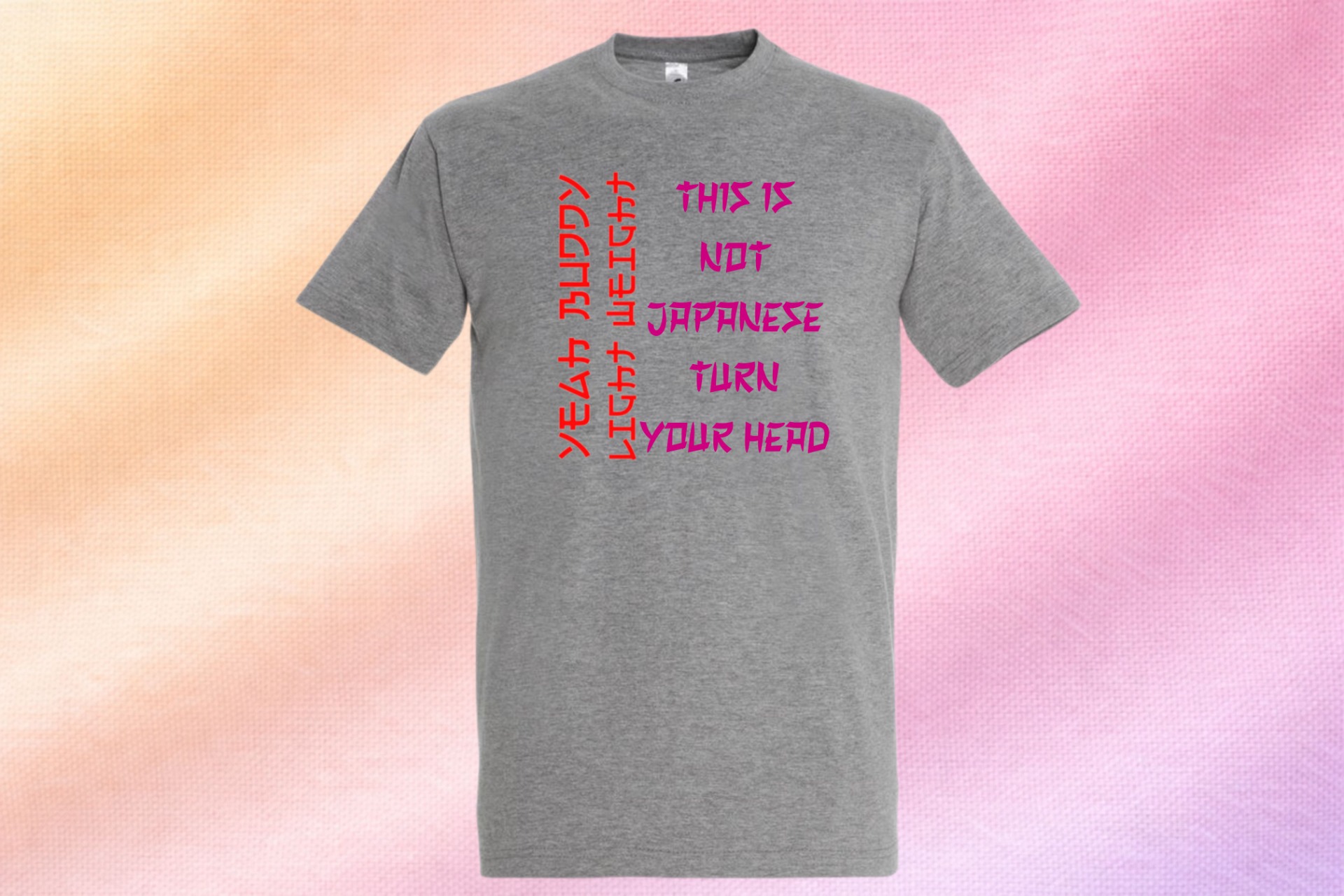 Figyelemfelkeltő, humoros design "This Is Not Japanese – Turn Your Head" felirattal és különleges karakterekkel. Tökéletes választás azoknak, akik szeretik az egyedi, feltűnő pólókat.