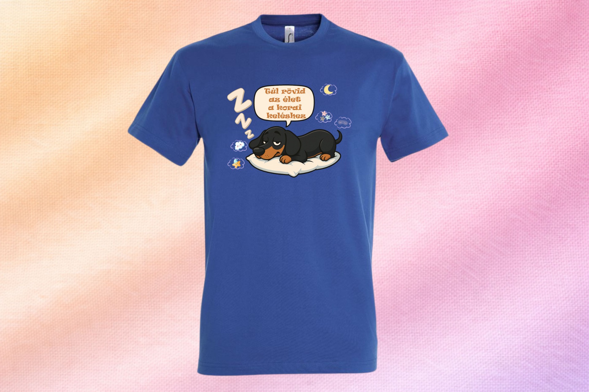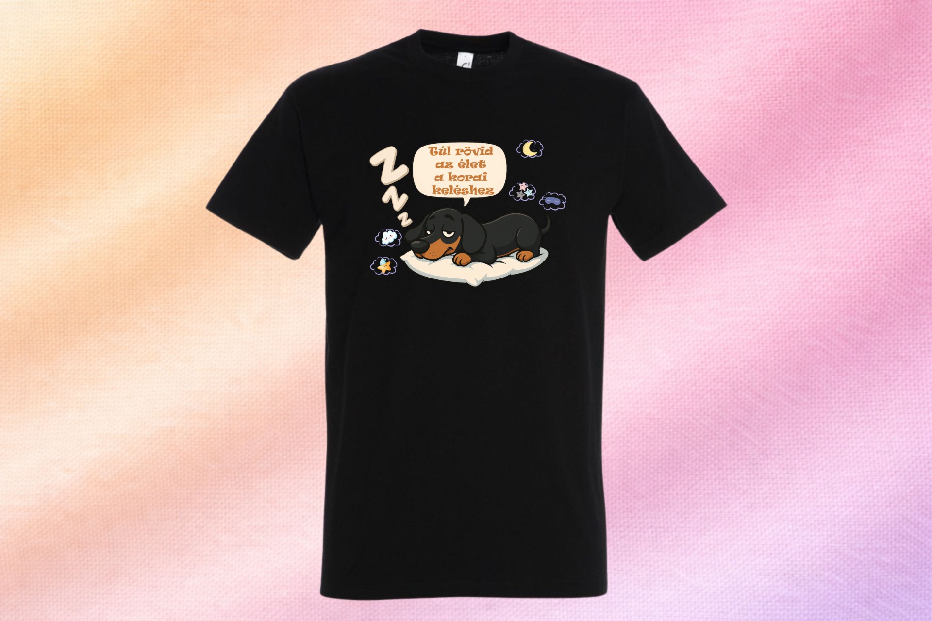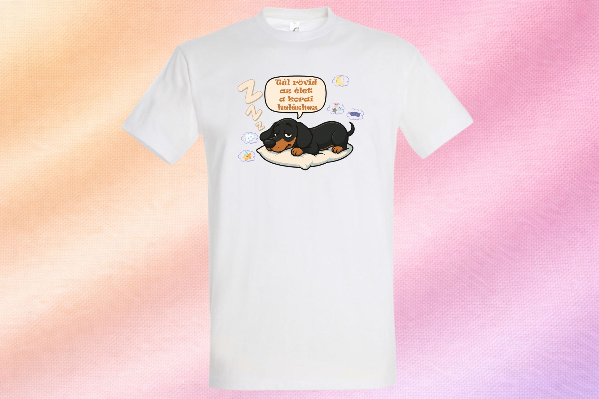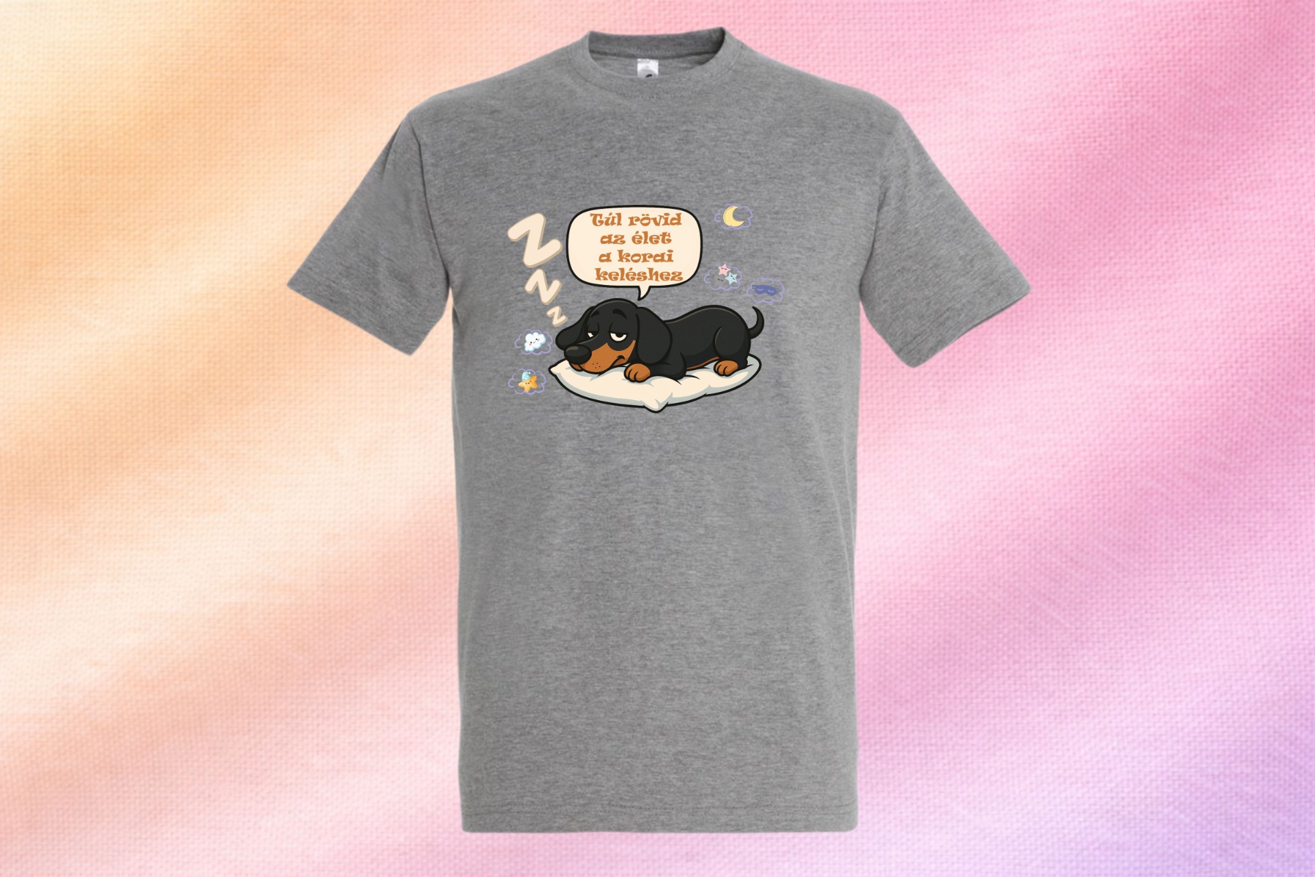 Ha a korán kelés nem a te műfajod, ez a póló neked készült! A szundizó tacskó és a frappáns felirat tökéletesen kifejezi a "még 5 perc" életérzést – garantáltan sokakra ráismernek benne.